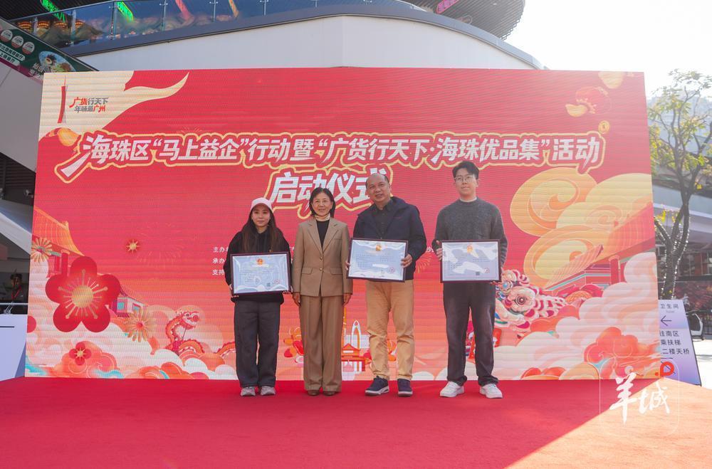 据悉,向新进驻商户现场颁证,有着政府部门“送服务上门”的寓意。在“广货行天下·海珠优品集”活动举办期间,广州市海珠区市场监管部门将通过“马上益企”行动,向企业提供从登记注册到许可审批的全程指引与优先服务,实现“企业零跑腿、办事加速度”。 通过“一网通办”“一窗受理”等行政审批优化流程,把服务送到企业商户门口,让企业商户专心把广货做强做精,专心经营。海珠区市场监管部门还会对多种广货,特别是近期热销的年货类商品开展专项抽检,严厉打击假冒伪劣、价格欺诈等行为,守护“海珠优品”品质与声誉。