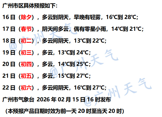 16日(除夕),多云到阴天,早晚有轻雾,16℃到28℃;