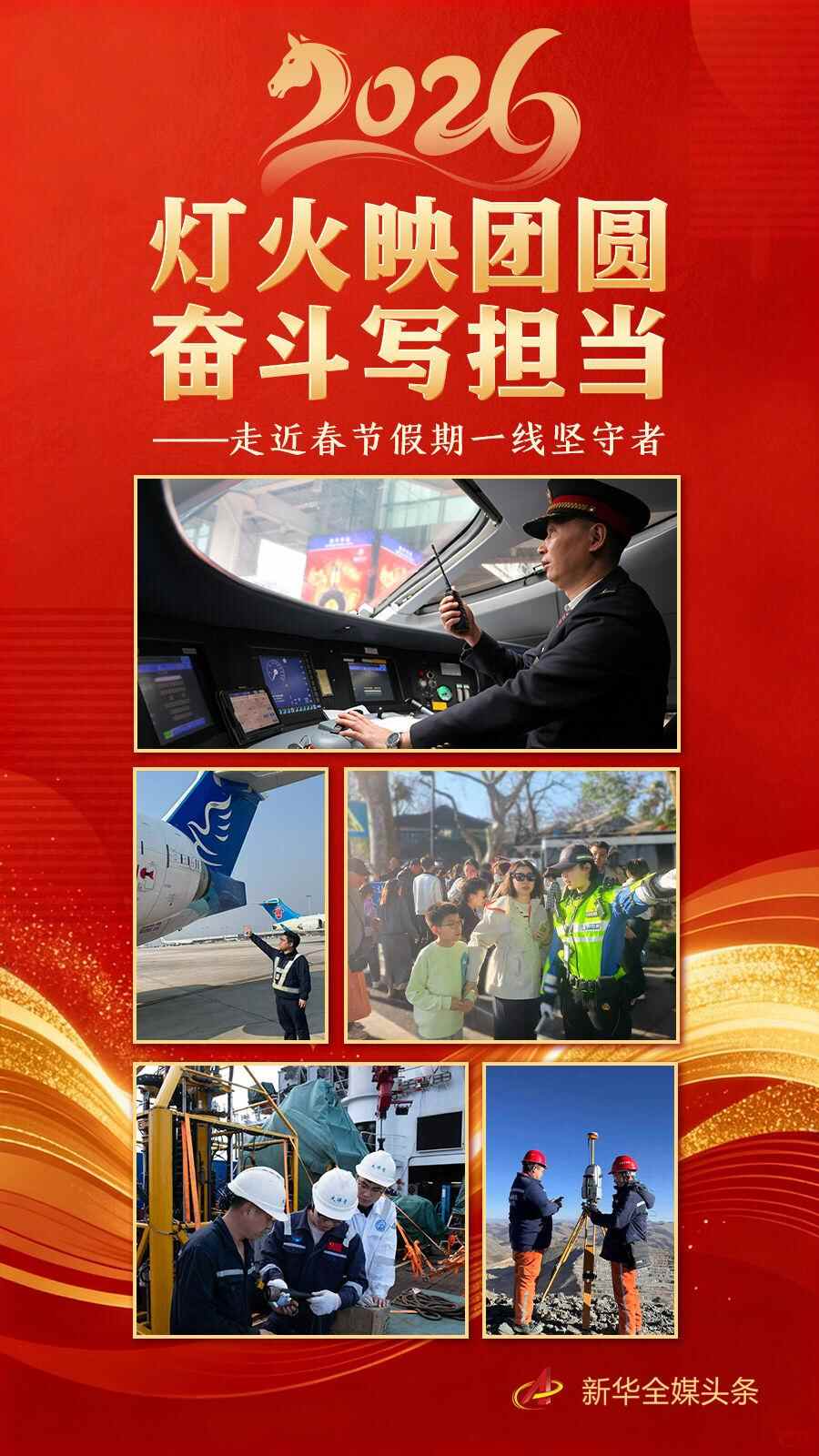 马跃新程、山河焕彩。从交通枢纽到城乡巷陌,从蔚蓝大海到雪域高原,无数劳动者扎根一线,书写奋斗画卷。他们缺席个人小家的团聚,却成全了社会大家的团圆。他们默默耕耘,守护节日里的中国,汇聚成奔跑向前的中国。