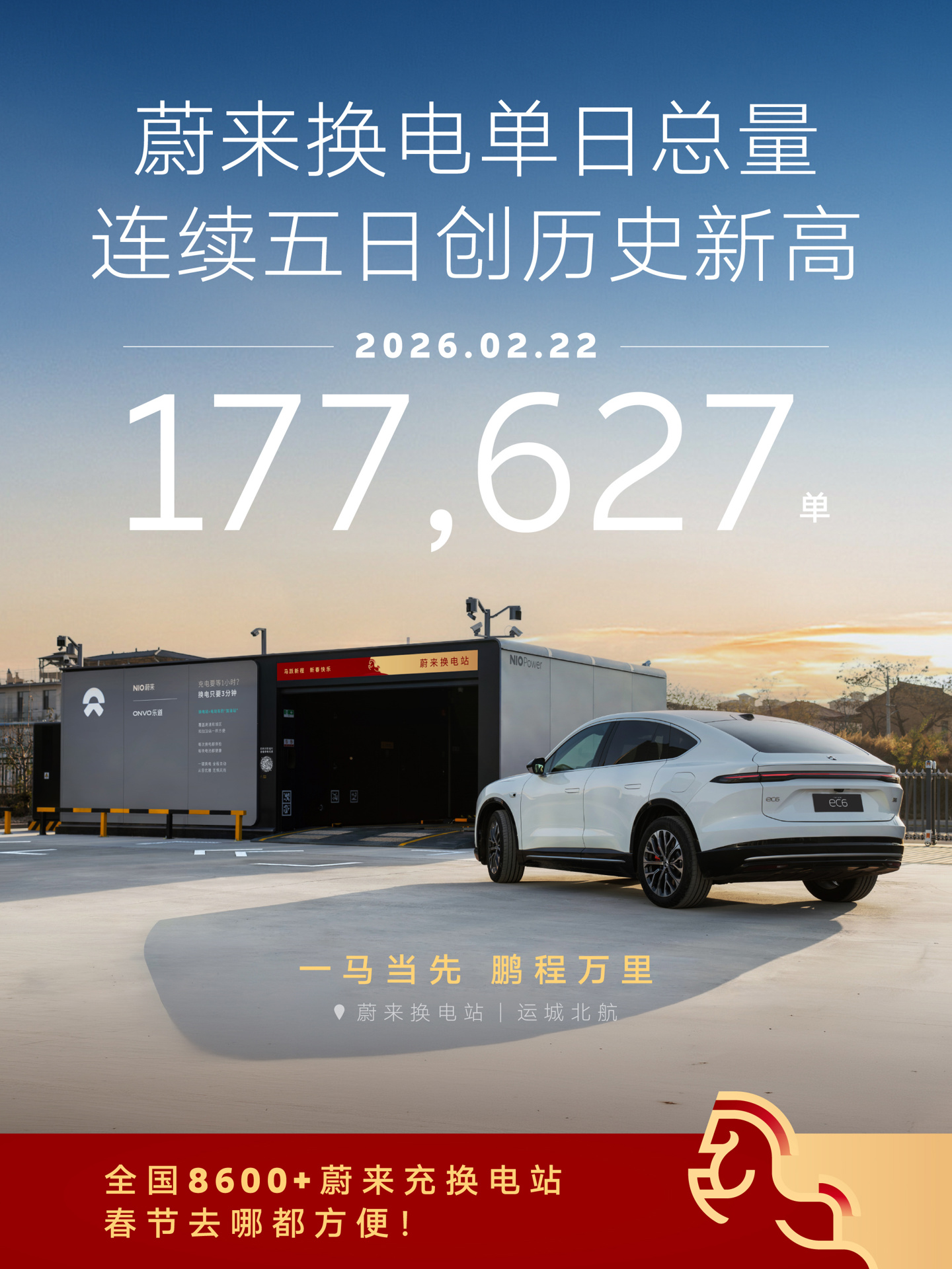 蔚来换电站具备九大优势,包括3分钟极速加电、电池体检、按需灵活选择电池、车电分离、全程自动操作、城区和高速公路换电站布局、优化充电电流延长电池寿命、电池灵活拆卸便于回收再利用,以及车网互动减少能源浪费。2026年2月22日,蔚来换电单日总量达177,627次,创历史新高。目前,全国已建成超8,600座蔚来充换电站,其中换电站超3,700座,高速公路换电站超1,000座,覆盖全国550城。