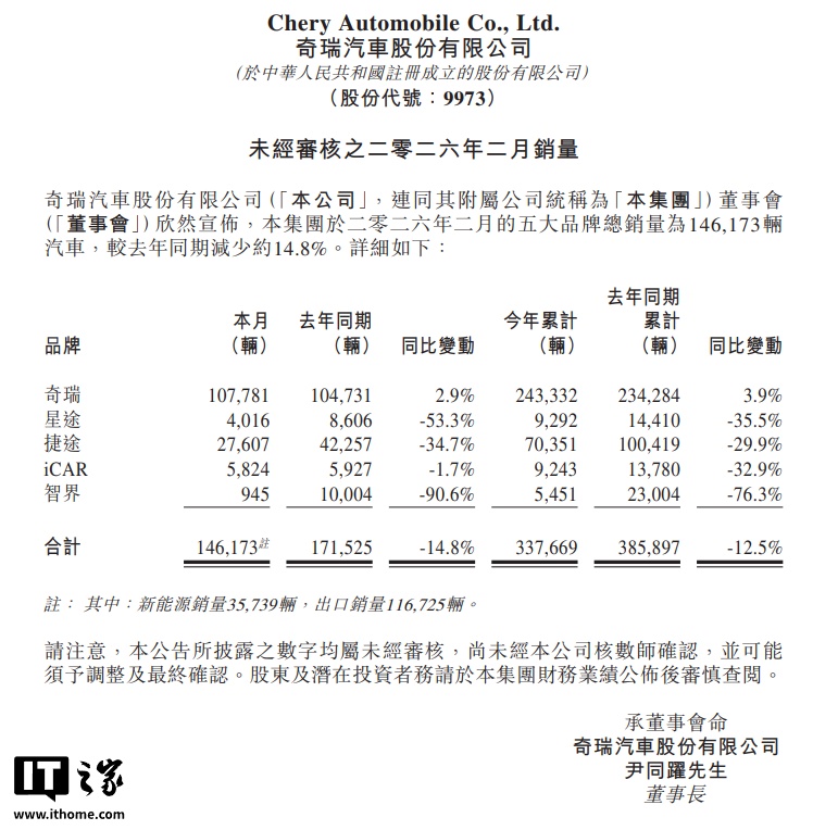 3月1日,奇瑞集团发布2026年2月汽车销售数据,当月共销售汽车16.1万辆,其中奇瑞汽车销量为146173辆,同比下滑14.8%。在新能源汽车领域,奇瑞集团2月销量达到35,739辆,出口销量为116,725辆,助力奇瑞集团成为中国品牌车企中首个“出海600万”的里程碑。
