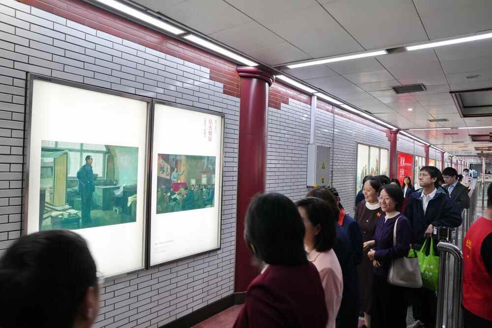 今年是毛泽东同志主办第六届农民运动讲习所100周年。步入地铁站厅,一幅幅经典画作将革命历史的重要瞬间定格于眼前。展览以“美术作品里的中国革命”为独特视角,用艺术语言讲述党史故事,农讲所纪念馆美术组20世纪70年代创作的油画《毛泽东率领学员纪念沙基惨案一周年游行》,再现了毛泽东同志带领农讲所学员参加反帝示威游行的历史场景;关山月的国画《星火燎原》以磅礴笔墨描绘革命火种播撒南粤的壮阔图景;雷坦的油画《飞夺泸定桥》将红军长征途中惊心动魄的战斗场面凝固于画布之上。