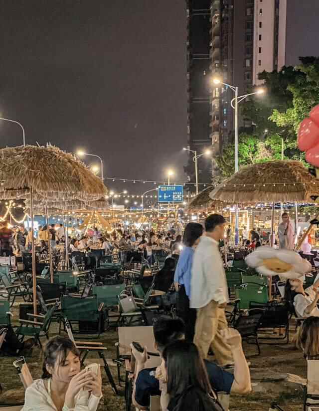 入夜后,创产夜市上百个摊位飘香,炭火烧烤、牛杂、手打柠檬茶应有尽有。工业风的厂房与集装箱酒吧街碰撞出赛博朋克感,周末常有醒狮表演和街头Live。