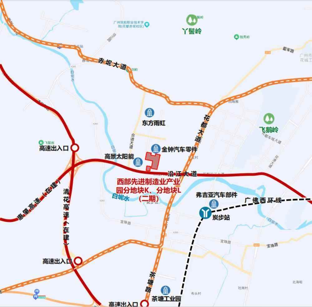 位于花都西部智能新能源汽车城,沿江大道以北花都大道西侧,紧邻在建惠肇高速,距离南侧广州绕城高速收费站约4.5公里,交通较为便利,周边产业较为集聚。距离广佛西环线城际炭步站2.8公里。