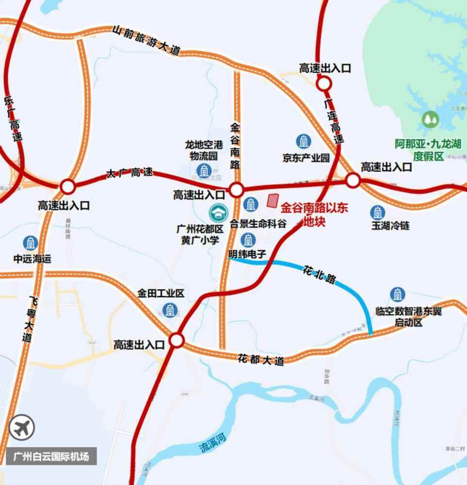 位于花都东部临空数智港,金谷南路以东,大广高速以南,距白云国际机场约8公里。地块周边高、快速路网发达,可便捷连通白云国际机场。目前地块周边已集聚较多物流园区、产业园区,交通区位及产业发展基础良好。