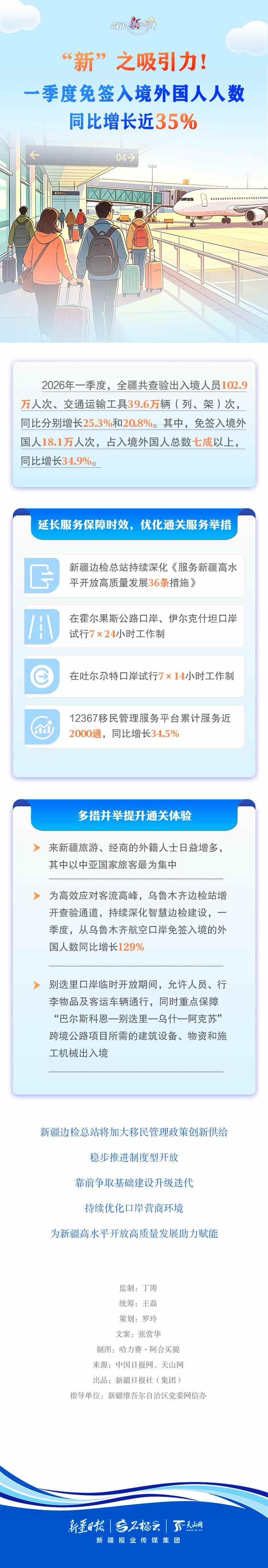 2026年一季度新疆出入境数据火热出炉:全疆共查验出入境人员102.9万人次、交通运输工具39.6万辆(列、架)次,同比分别增长25.3%和20.8%。其中,免签入境外国人达18.1万人次,占入境外国人总数七成以上,同比增长34.9%。免签“朋友圈”扩容,航线越飞越密,带来了“硬核吸引力”;通关更快、手续更简,跑出了“便利加速度”。本期《数说“新”变化》,一同关注。