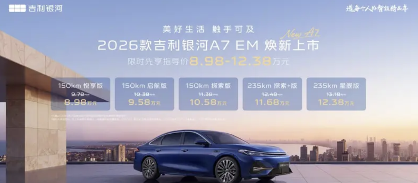 今日,吉利汽车发布了2026款银河A7EM/A7EV双车系列,标志着品牌在新能源汽车领域的进一步拓展。银河A7EM的上市限时先享指导价从8.98万元起,而银河A7EV则从10.28万元起。这两款车型均采用了“银河涟漪”设计美学,前脸的银河涟漪贯穿前灯与车尾的旭日东升贯穿尾灯相呼应,车身则保留了传统造型门把手。