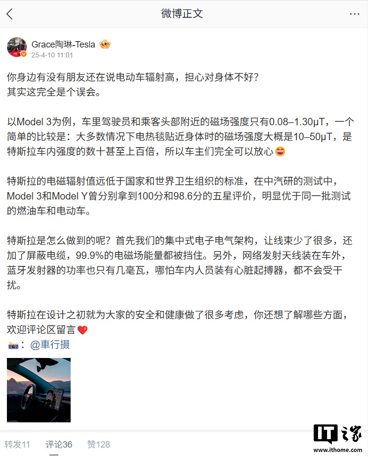 4月10日,特斯拉副总裁陶琳通过微博对“电动车辐射高”的误解进行了澄清。她指出,特斯拉Model 3车内驾驶员和乘客头部附近的磁场强度仅为0.08-1.30μT,远低于电热毯贴近身体时的磁场强度,仅为其0.8-2.6%,因此车主无需担心辐射问题。