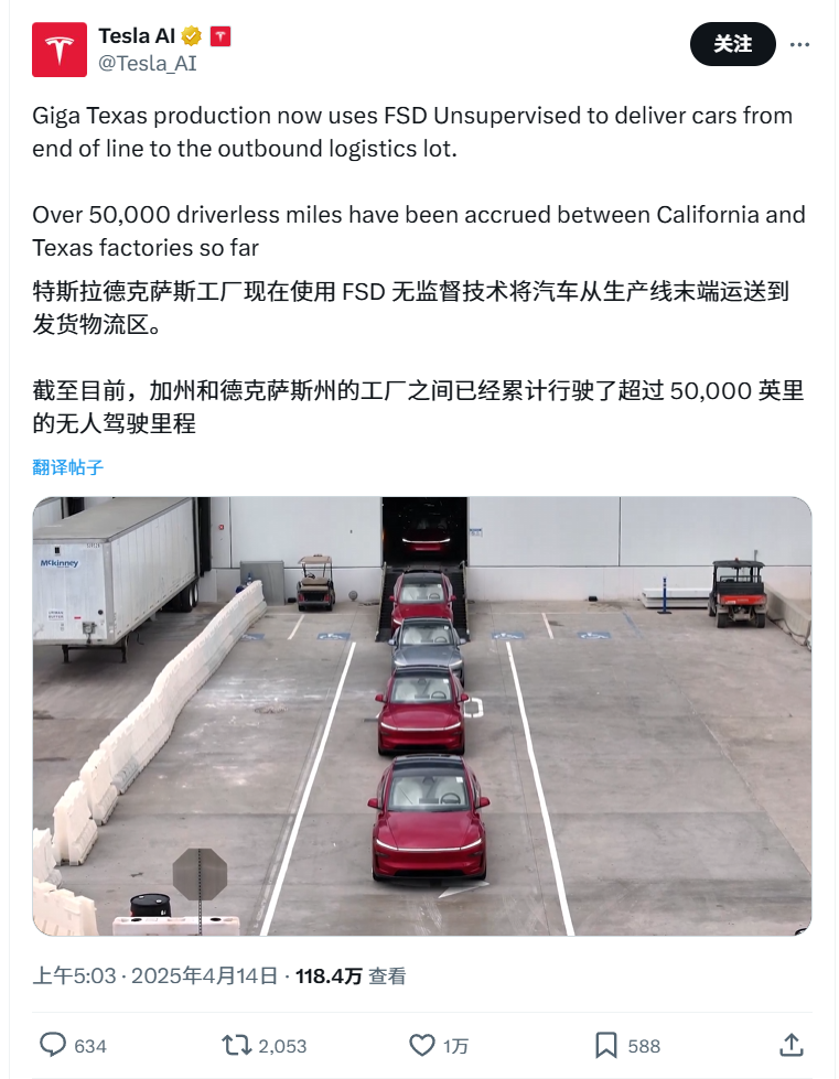4月14日,特斯拉宣布其“无监督”FSD系统已实现超过50000英里的自动驾驶里程,且无需人工干预。这些测试主要在特斯拉工厂内部进行,涉及新款Model Y和Cybertruck从生产线到交付停车场的自动行驶。自动驾驶车辆利用最新的AI4硬件,能够应对复杂的道路环境,包括交通标志、工厂建设、行人和机械化交通等,并且车辆之间能够互相通信以避免碰撞。