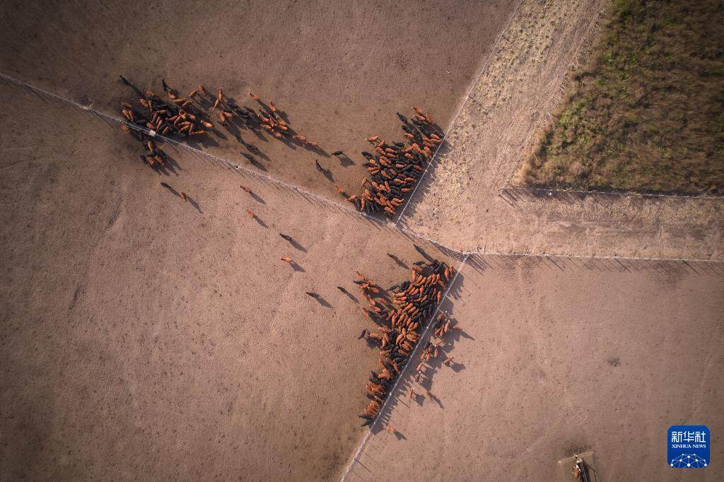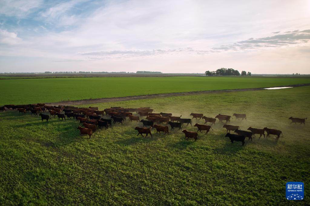 5月14日,牛群在阿根廷潘帕斯草原莱因迪亚纳牧场奔跑(无人机照片)。新华社记者 孟鼎博 摄