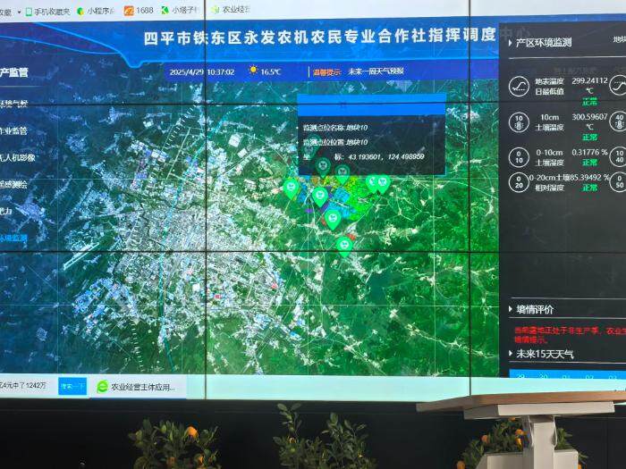 在吉林省四平市铁东区永发农机农民专业合作社指挥调度中心,大屏幕上能实时查看土地耕种进度和土壤状态(2025年4月29日摄)。新华社记者孙鹏程摄