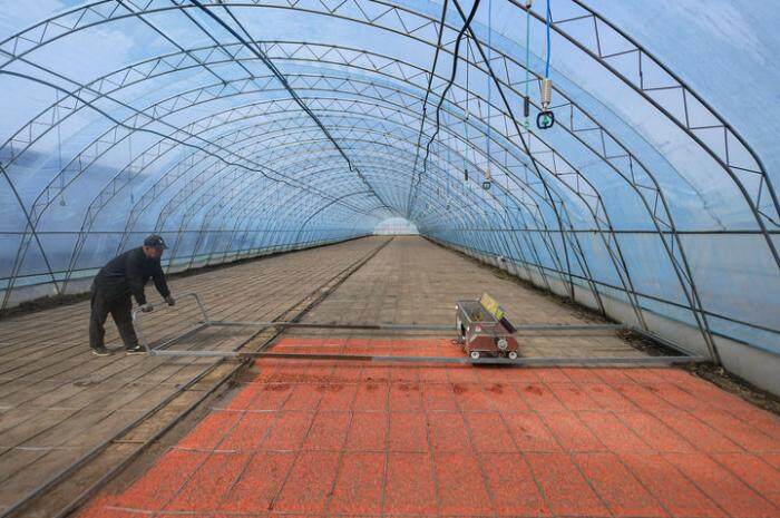 在吉林省吉林市永吉县岔路河镇团结村,永吉县鑫丰种植农民专业合作社农民操作农机进行水稻育苗工作(2025年4月8日摄)。新华社记者张楠摄